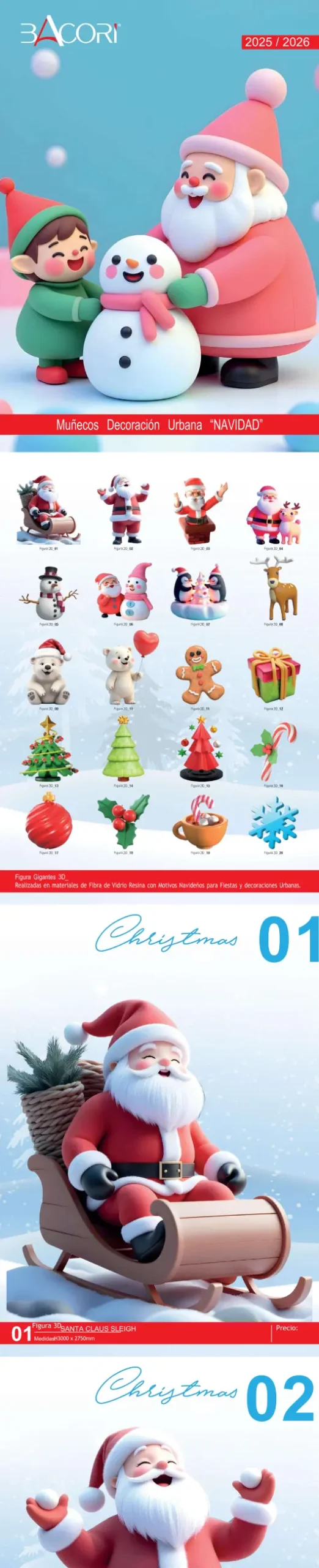 Catálogo 2025/2026 de figuras navideñas 3D para decoración urbana: Santa Claus, muñecos de nieve, renos, árboles, osos, dulces y elementos festivos. Fabricadas en fibra de vidrio con acabados resistentes para eventos, calles y espacios públicos.